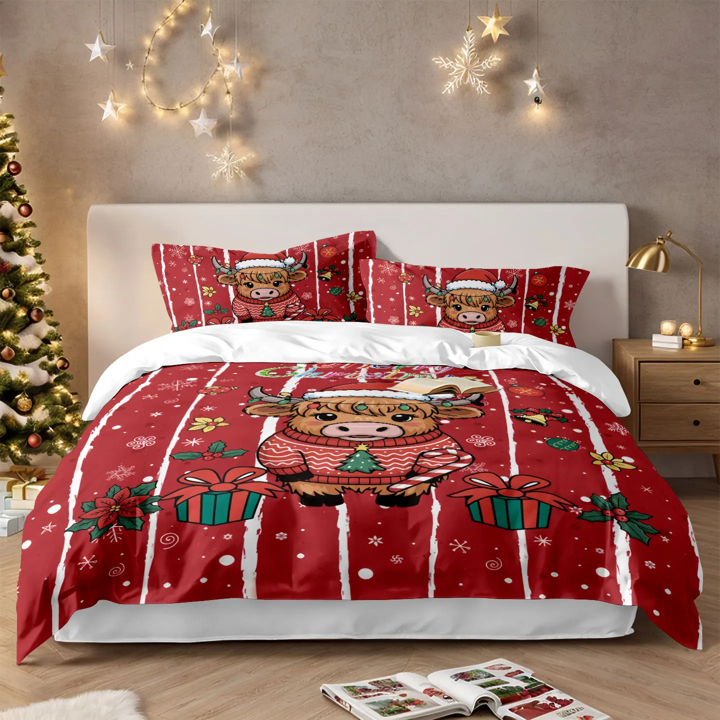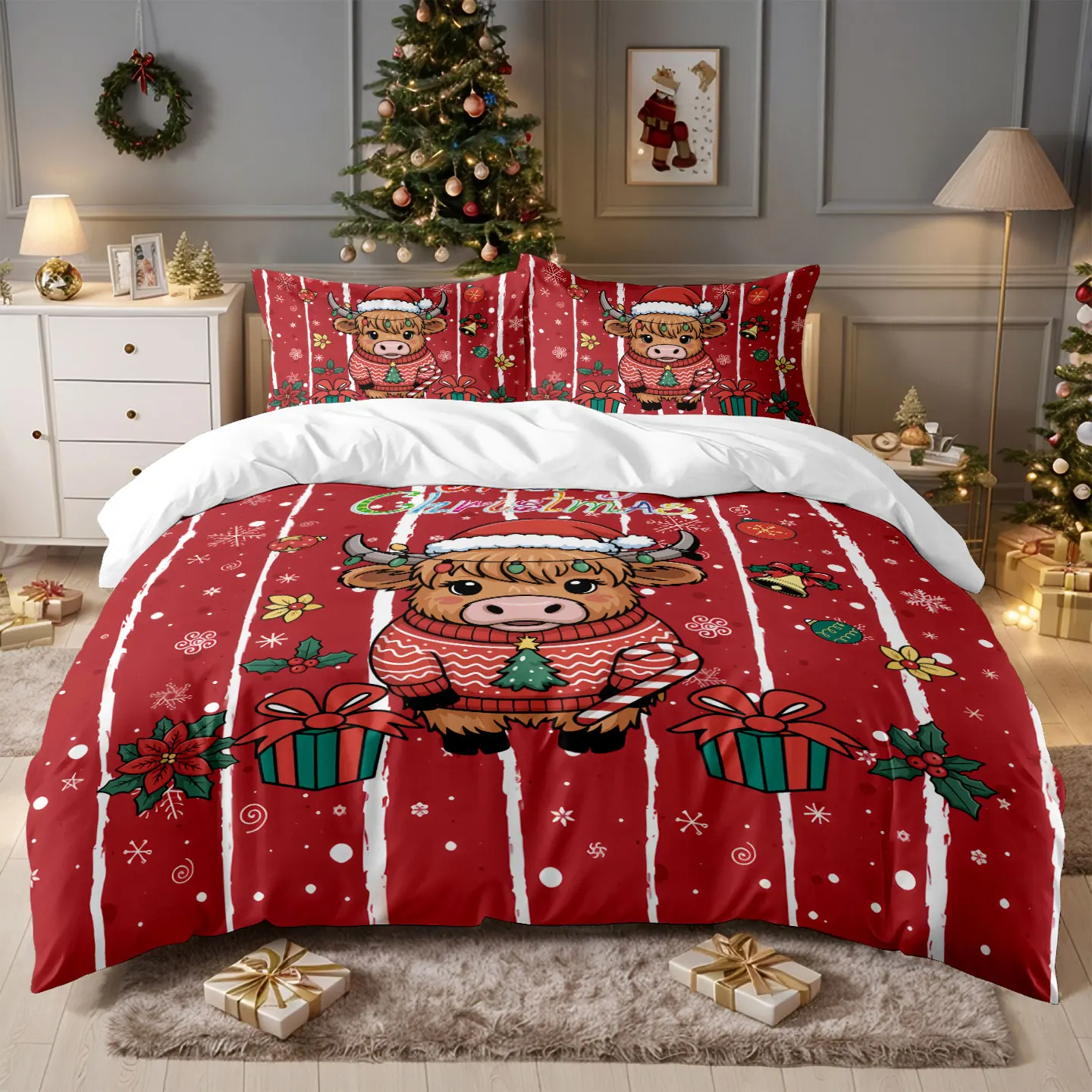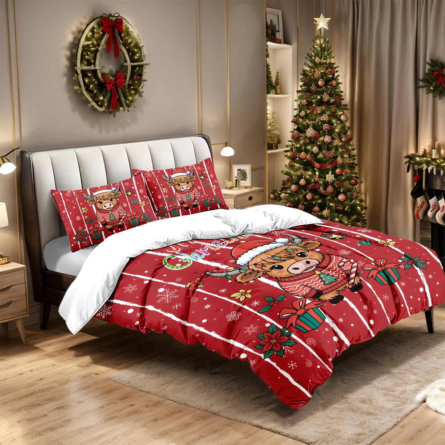 3pcs Christmas Highland Cow Quilt Set – Soft, Washable Holiday Bedding